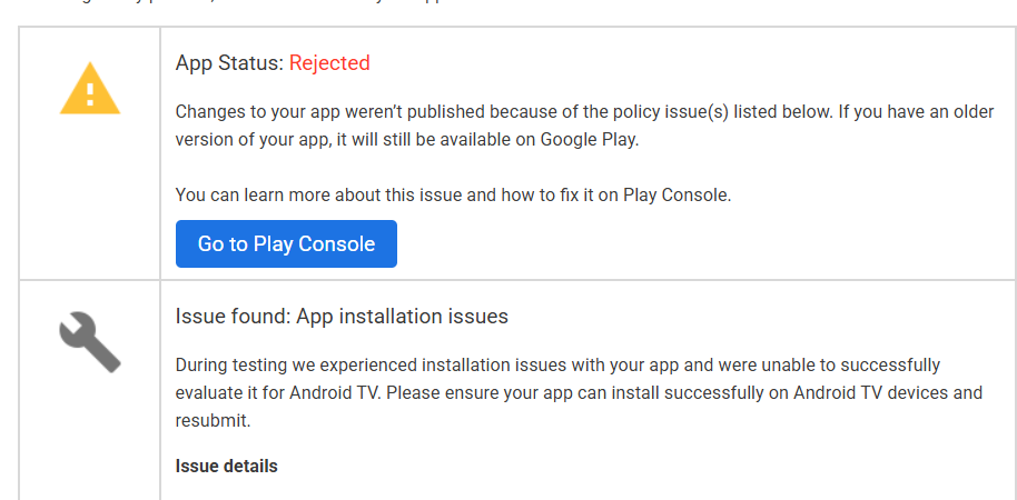 Google Play rejects many apps targeting TV with this infamous claim. It takes many months for some developers to figure out exactly what it means. During this head scratching period, app users suffer from being unable to access the TV versions of the rejected apps. Contacting Google Play usually has little use.